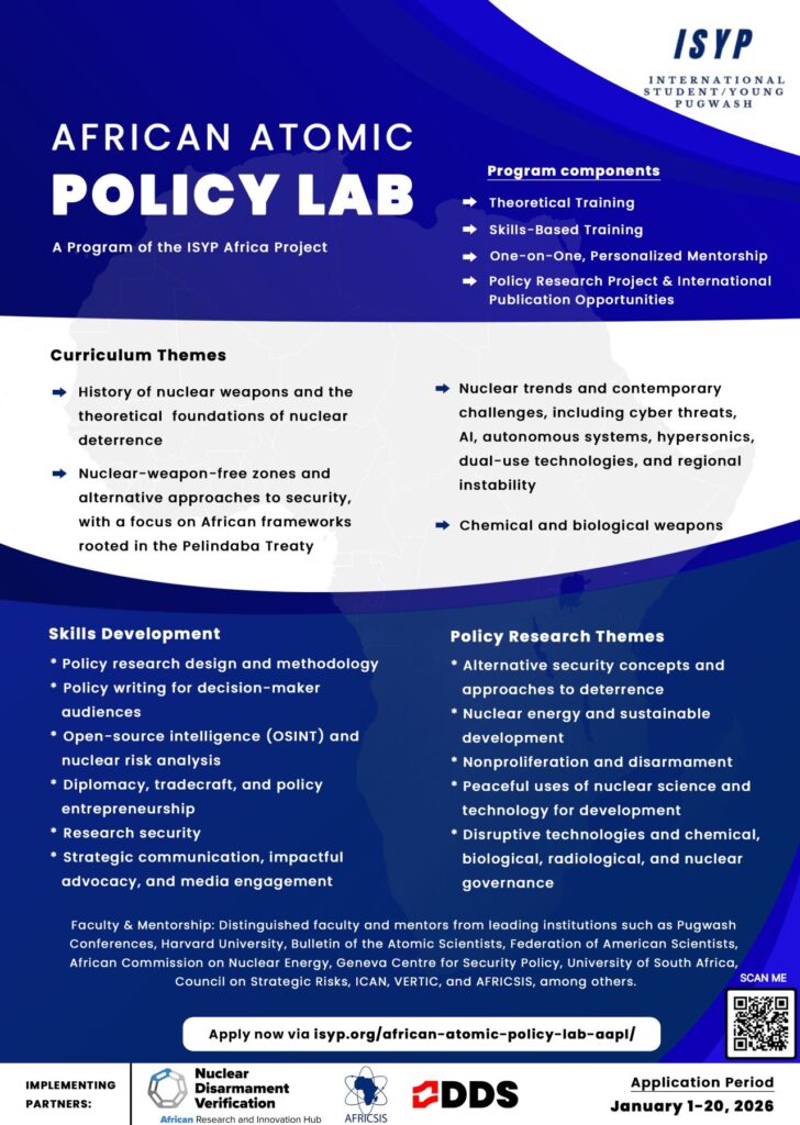 The AAPL is a 7-month program designed to develop the next generation of African nuclear policy experts and amplify African leadership in global nuclear and security policy debates. It is organized by the International Student/Young Pugwash (ISYP) Africa Project. Learn more and apply by 20 January 2026: https://isyp.org/african-atomic-policy-lab-aapl/