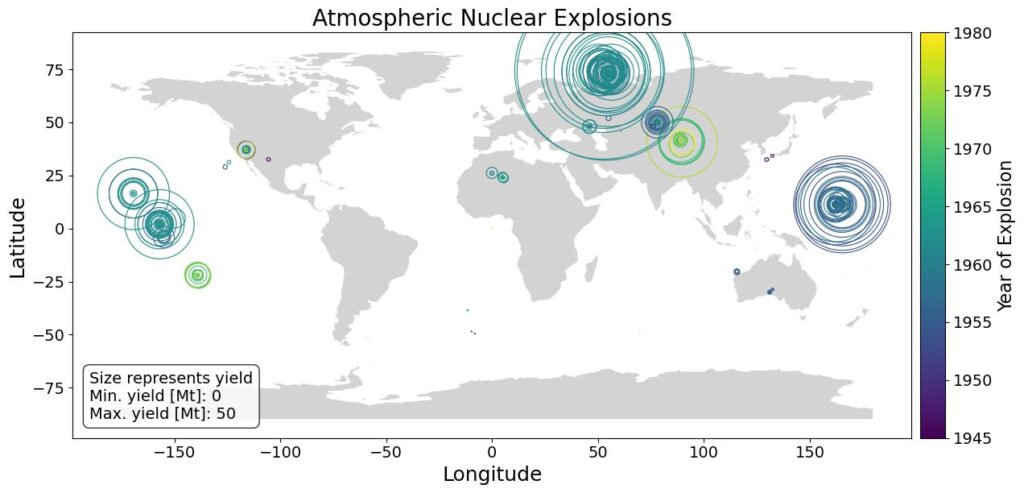 The map shows the location of all 528 atmospheric nuclear tests with the marker size being proportional to the total energy yield and the marker color coding representing the time it was conducted.